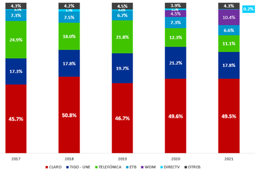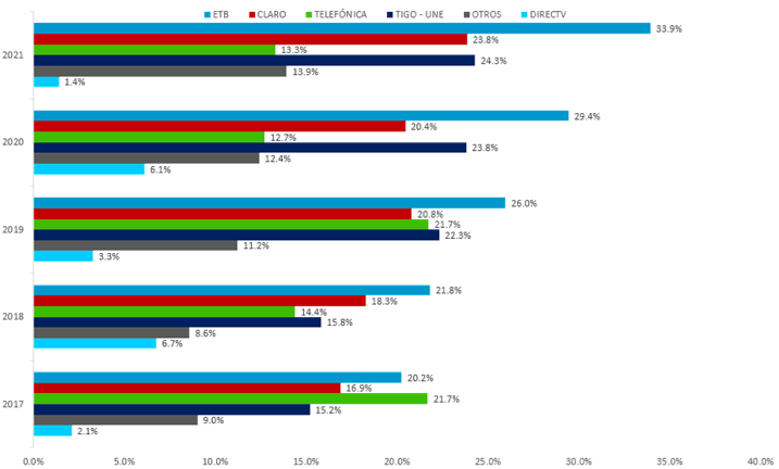 18. Los operadores incluidos son: AVANTEL, COLUMBUS NETWORKS, AZTECA COMUNICACIONES, IFX NETWORKS, CENTURYLINK, TELEBUCARAMANGA (sus datos solo están disponibles hasta 2017, año previo a su fusión con COLOMBIA TELECOMUNICACIONES), HV TELEVISIÓN, AXESAT, VIRGIN MOBILE, BT LATAM, INTERNEXA, TELXIUS, PROMIGAS, MEDIA COMMERCE, ENERGÍA INTEGRAL ANDINA, UFINET, LOGÍSTICA FLASH, ÉXITO, BT LATAM y HUGHES. Por facilidad de visualización no se muestra la información desagregada para cada una de estas empresas en la gráfica.