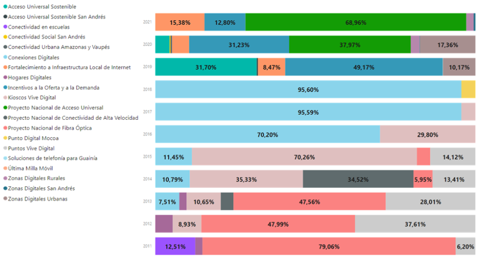 Los proyectos tomados como relevantes para este reporte se presentan en la Gráfica 2 en la cual se puede apreciar la distribución año a año de la ejecución presupuestal para cada uno. Para el año 2021, al igual que en 2020, el proyecto en que más recursos invirtió el MinTIC fue el Proyecto Nacional de Acceso Universal, con una ejecución de más de 400 mil millones de pesos. En los años anteriores, los proyectos con mayor CAPEX relativo fueron el Proyecto Nacional de Conectividad de Alta Velocidad y el Proyecto Nacional de Fibra Óptica (entre 2011 y 2014), Kioscos Vive Digital (entre 2014 y 2015), el Proyecto de Conexiones Digitales (entre 2016 y 2018), y los Proyectos de incentivos a la oferta y a la demanda (2019).