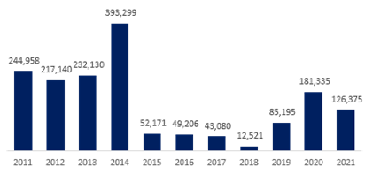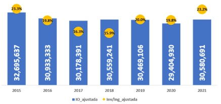 - Este crecimiento se evidencia también para la relación entre inversión e ingresos, la cual en 2021 (23,2%) se acercó al valor histórico más alto registrado en 2015 (23,3%).