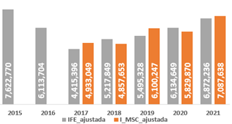 Una tendencia creciente en el nivel de inversión se evidencia desde el año 2017 hasta el 2021, tomando como referencia las cifras del MSC, que se consideran más cercanas a la ejecución real de la inversión pues contempla los activos denominados como relevantes13. Se aprecia que la inversión calculada a partir del MSC, que había presentado una caída entre 2019 y 2020, presentó un crecimiento en 2021 de 27,3% con respecto a la vigencia 2020 y una tasa anual de crecimiento constante del 13,1% en el período 2017 a 2021 (ver Gráfica 4).