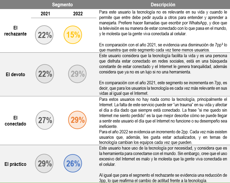 A nivel general, los cambios más importantes de los usuarios por estrato socioeconómico se evidencian en el segmento “el devoto”, el cual presentó crecimiento en todos los estratos analizados, mientras que el segmento “el rechazante” presentó reducción. Es decir, que cada vez son más usuarios los que disfrutan estar conectados redes sociales, y consideran que el Internet ya no es un lujo si no una herramienta.