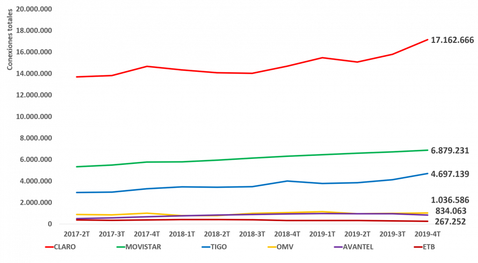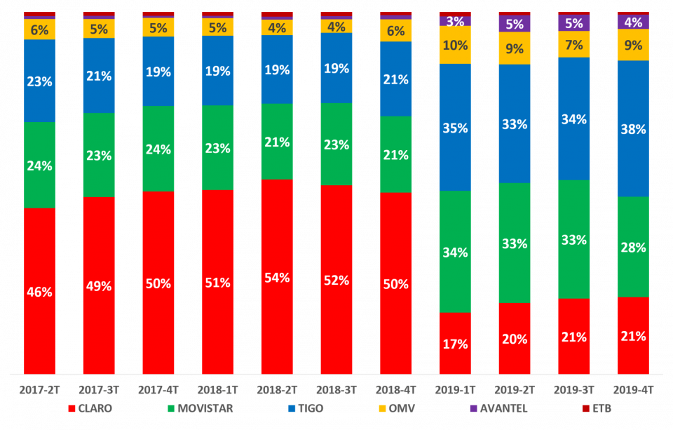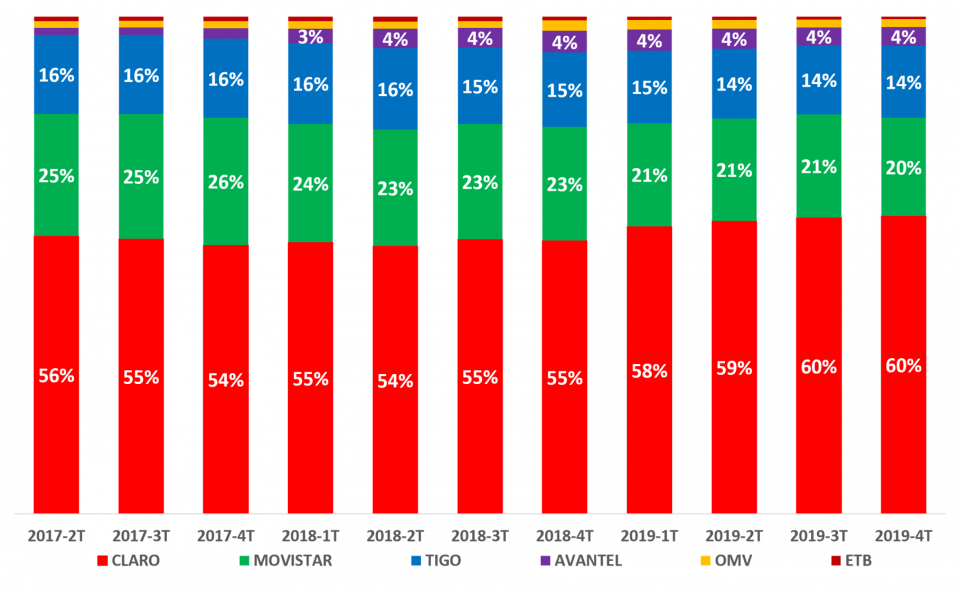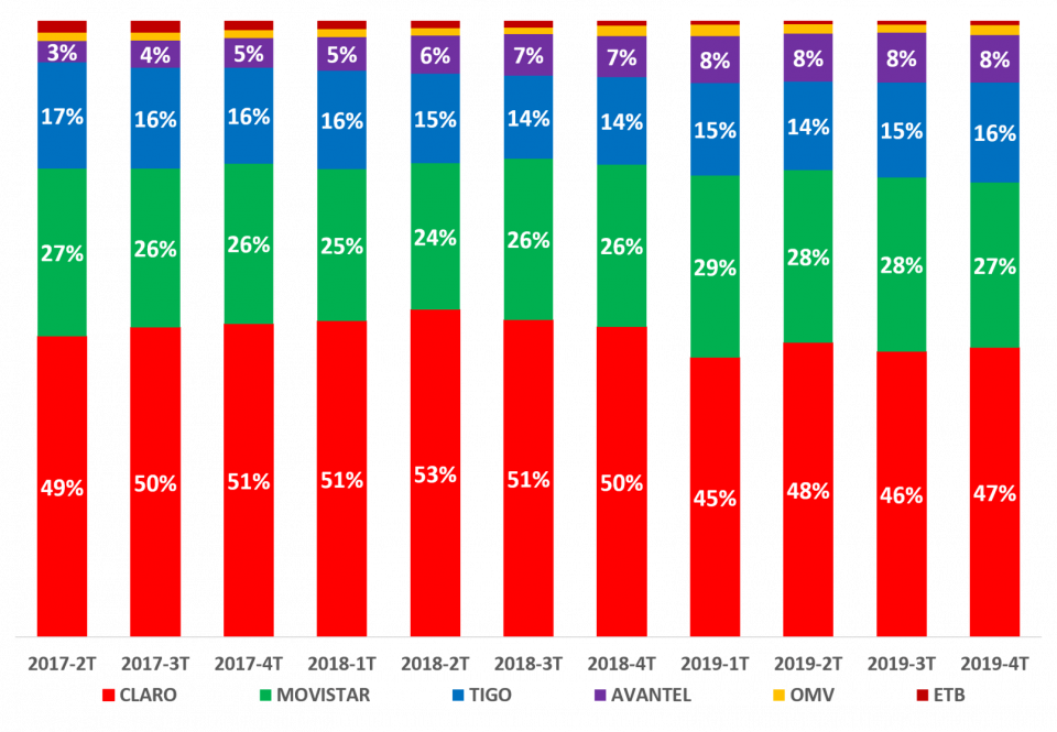 En el 2019-4T, en comparación con el 2018-4T, CLARO incrementó su participación al 56%, MOVISTAR disminuyó al 22%, TIGO mantuvo su participación en 15%, AVANTEL disminuyó su participación al 3%, VIRGIN MOBILE mantuvo su participación en 2%, ETB y MÓVIL ÉXITO mantuvieron su participación en 1%, FLASH MOBILE disminuyó al 1%, y SUMA MÓVIL se mantuvo en el 0,01%.
