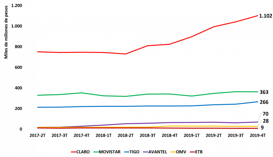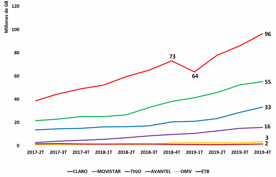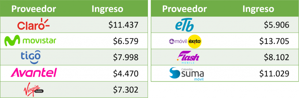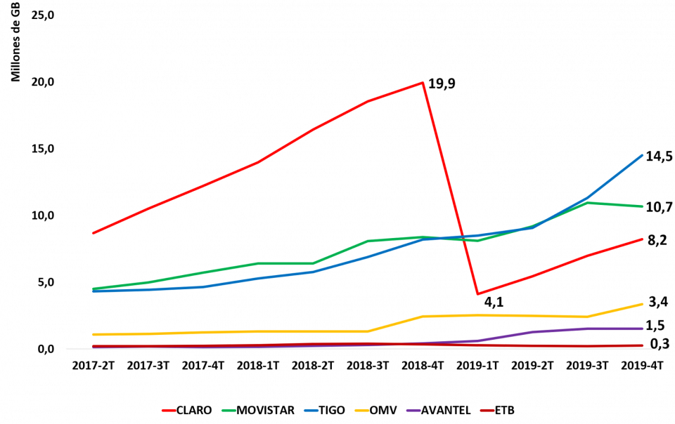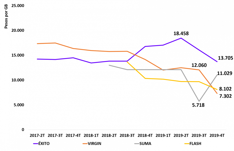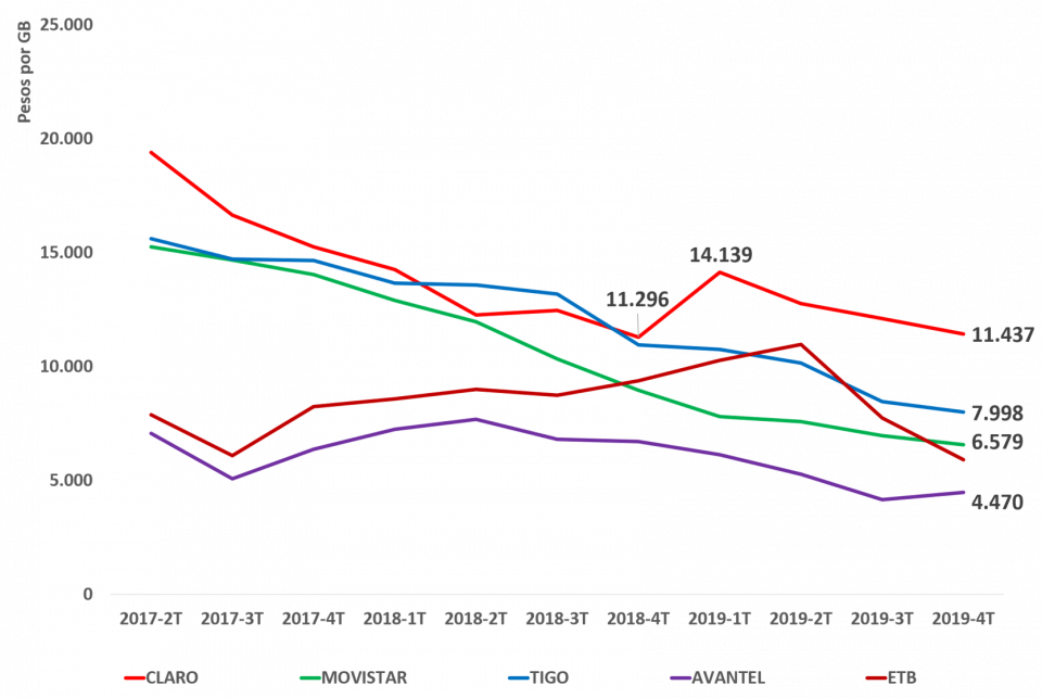 Para el 2019-4T, el ingreso promedio por GB fue de $11.437 para CLARO, $6.579 para MOVISTAR, $7.998 para TIGO, $4.470 para AVANTEL, $5.906 para ETB, $8.102 para FLASH MOBILE, $7.302 para VIRGIN MOBILE, $13.705 para ÉXITO y $11.029 para SUMA MÓVIL.