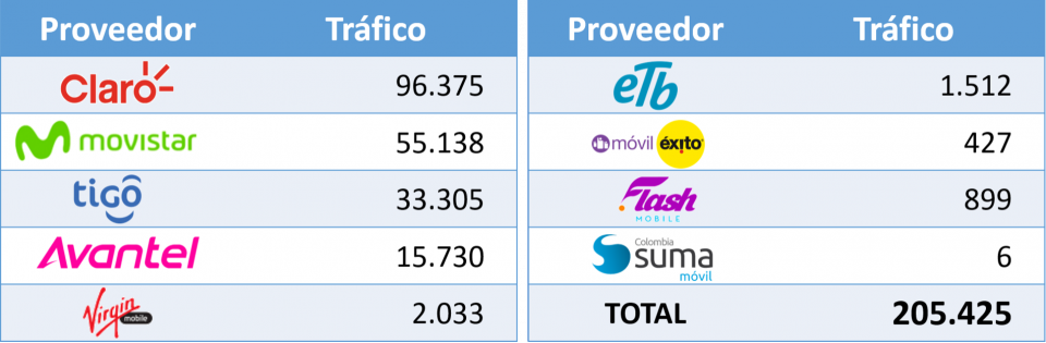 Para el 2018-4T, CLARO presentaba una participación en el tráfico de Internet móvil por demanda del 50%, MOVISTAR del 21%, TIGO del 21%, los OMV (Éxito, Flash Mobile, Suma Móvil y Virgin) del 6%, AVANTEL del 1% y ETB del 1%.