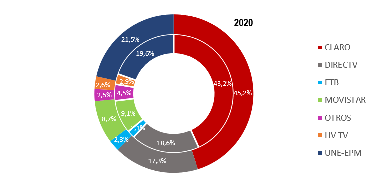 Con respecto a la distribución de suscriptores por operador, CLARO fue la empresa que registró la mayor participación del total de suscriptores con el 45,17% para 2020, aumentado así 1,99 puntos porcentuales con respecto a 2019. En segundo lugar, se encuentra UNE con un 21,5% de participación, y un aumento 1,9 puntos porcentuales. DIRECTV cuenta con una participación del 17,32%, lo cual representa 1,33 puntos porcentuales menos respecto de 2019. También se registran participaciones importantes en el total de suscriptores como las de MOVISTAR (8,7%), HV TV (2,6%) y ETB (2,3%).
