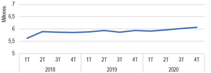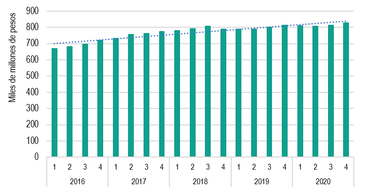Ahora bien, para el caso en particular del 2020, se evidenció un comportamiento en dos sentidos: una disminución de los ingresos durante los dos primeros trimestres del año de 9,27% en promedio por trimestre, respecto de cada trimestre inmediatamente anterior; mientras que durante el tercer y cuarto trimestre del año se presentaron crecimientos de 0,54% y 1,83%, respectivamente, lo que puede ser atribuido a las medidas de aislamiento preventivo con ocasión de la pandemia del COVID-19.