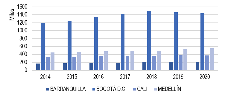 Por último, al llevar a cabo el análisis geográfico de la distribución de los suscriptores se evidenció que las cuatro (4) ciudades principales (Bogotá, Barranquilla, Cali y Medellín) representan el 42,68% del total de suscriptores de televisión por suscripción en el país. Al revisar de manera detalla el comportamiento de los suscriptores se encontró que las ciudades de Medellín y Barranquilla presentaron un incremento frente al 2019, con variaciones de 5,1% y 2,2%, respectivamente, a diferencia de las ciudades de Bogotá y de Cali cuya variación fue negativa, pues los suscriptores disminuyeron en -1,6% y -1,3%, respectivamente.