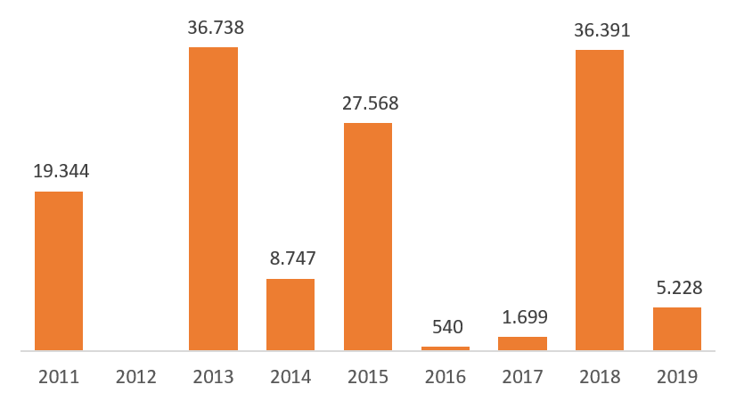 De acuerdo con lo indicado por RTVC las cifras de inversión para 2012 y 2020 se encuentran en cero pues en dichos años no hubo ejecución de dinero para el despliegue de estaciones de TDT. En los demás años, a partir de 2011 cuando inició la ejecución presupuestal con la ampliación del Centro de Emisión y la ampliación de la Cabecera Satelital9, el CAPEX de esta entidad para el citado proyecto osciló entre los 540 y 36.391 millones de pesos.