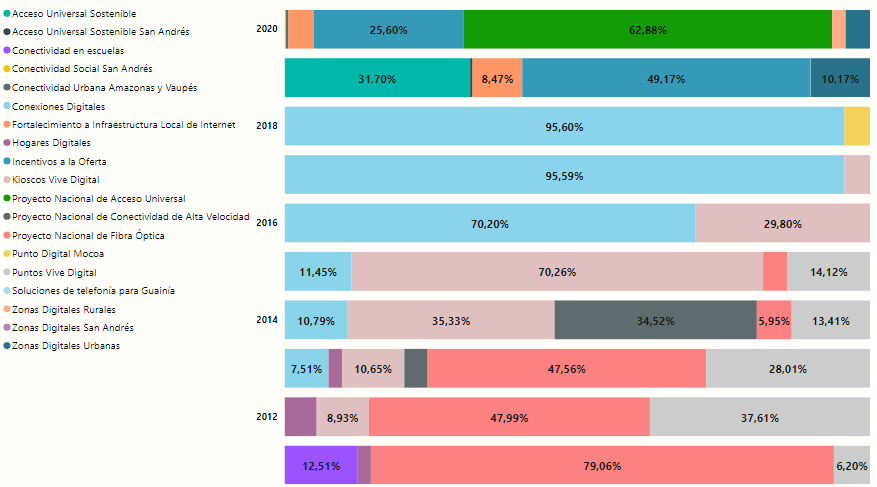 En los años 2017 y 2018, la inversión del MinTIC en despliegue de infraestructura se vio volcada hacia el proyecto de Conexiones Digitales, y en los años 2019 y 2020 los proyectos con mayor CAPEX fueron los de Incentivos a la Oferta y el Proyecto Nacional de Acceso Universal.