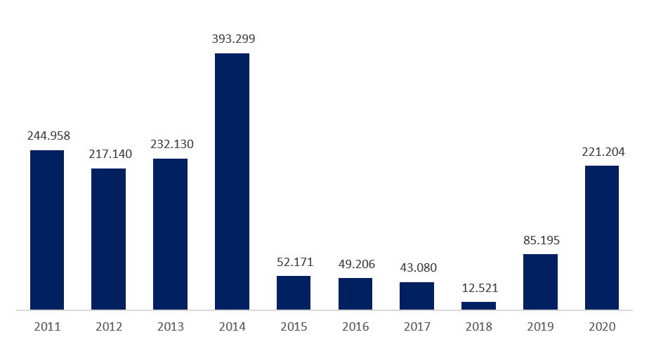 En la Gráfica 3 se presentan los valores del CAPEX del MinTIC para los proyectos que se ajustan a la definición de inversión adoptada por la CRC. Al respecto, si bien cabe reiterar que esta Comisión reconoce la existencia de más recursos comprometidos para ser ejecutados por parte del Ministerio, sin embargo no se encuentran incluidos en las cifras acá mostradas al no haber sido ejecutados en los periodos estudiados o por no ajustarse a la definición de inversión descrita previamente. El monto mínimo fue ejecutado en el año 2018 con un poco más de 12 mil millones de pesos y el monto máximo fue ejecutado en el 2014 con aproximadamente 393 mil millones de pesos.