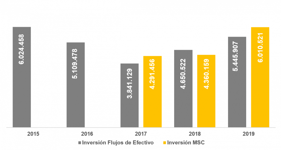 En la Gráfica 4 se presenta la evolución de la inversión en telecomunicaciones ejecutada por las empresas haciendo un comparativo, para los años en que es posible, entre la cifra calculada a partir de los Estados de Flujo de Efectivo y la cifra calculada a partir de lo reportado en el MSC. Como resulta evidente las cifras son semejantes, encontrándose para 2017 y 2019 un valor mayor para la inversión calculada a partir de la información del MSC.