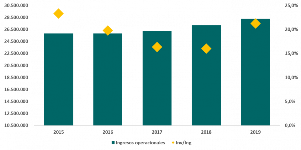 Como se observa en la Gráfica 5, los Ingresos Operacionales no siguen la tendencia mostrada para la inversión de las empresas, pues en este caso estos ingresos tienen una leve tendencia creciente entre 2015 y 2017, la cual evidencia una aceleración a partir de 2017. La información brindada por los rombos de color amarillo, que ilustran la evolución de la inversión como porcentaje de los ingresos operacionales, replica el comportamiento observado para la inversión y hace evidente una caída en la porción de los ingresos operacionales destinada a esta entre los años 2015 y 2018, en los cuales la proporción bajó de un 23,3% a un 16,0%. No obstante, en 2019 se aprecia un incremento en la proporción de los ingresos operacionales destinados a la inversión alcanzándose para dicho período un valor de 21,3%.