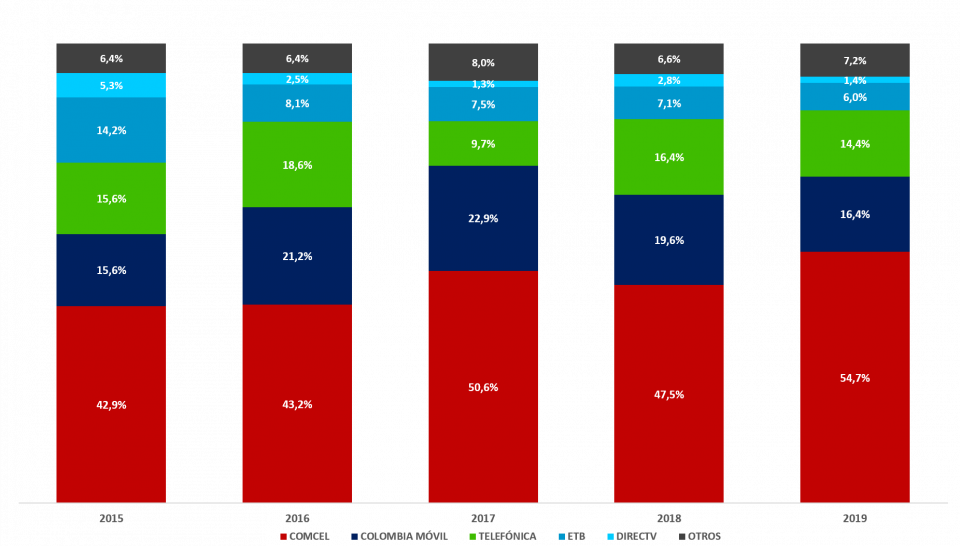 13 Los operadores incluidos son: AVANTEL, COLUMBUS NETWORKS, AZTECA COMUNICACIONES, IFX NETWORKS, CENTURYLINK, TELEBUCARAMANGA (sus datos solo están disponibles hasta 2017, año previo a su fusión con COLOMBIA TELECOMUNICACIONES), HV TELEVISIÓN, AXESAT, VIRGIN MOBILE, BT LATAM, INTERNEXA, TELXIUS, PROMIGAS, MEDIA COMMERCE y ENERGÍA INTEGRAL ANDINA.