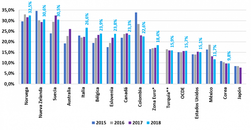 ** Los valores reportados por Turquía sugieren una participación de 43,6% en 2015, cifra que no guarda relación con ninguno de los demás países de la muestra, ni con la tendencia observada por ese mismo país en los años siguientes. Por esta razón el valor es eliminado de la Gráfica.