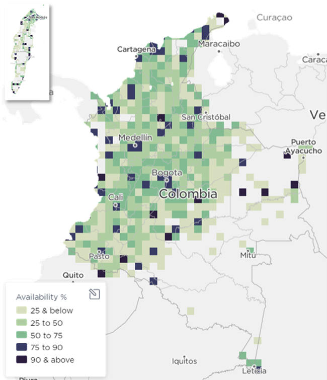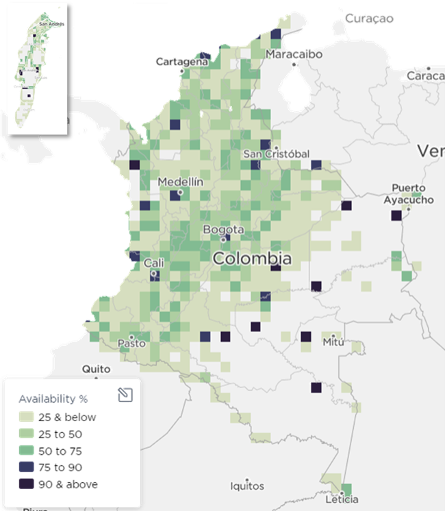 En los mapas a continuación (Gráfica 19), se compara el primer trimestre del año 2019 y el cuarto trimestre del año 2020, evidenciando una mayor densidad de zonas con porcentaje de disponibilidad de la tecnología 4G mayor al 90%.