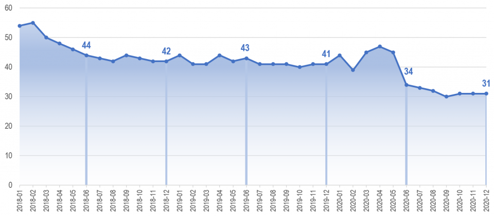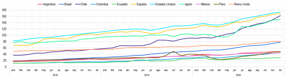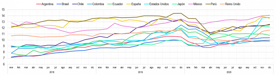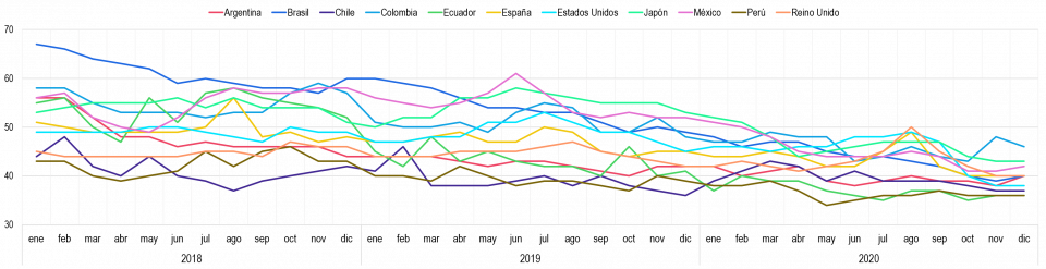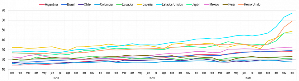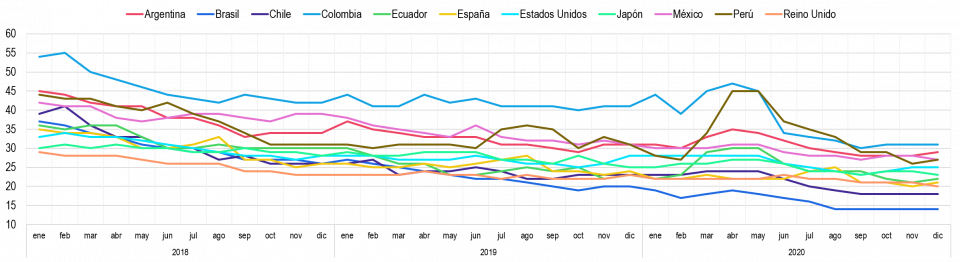 En general, este indicador ha mostrado (Gráfica 27) a lo largo del periodo comprendido entre enero del 2018 y diciembre de 2020, un comportamiento decreciente en todos los países pertenecientes al presente análisis.