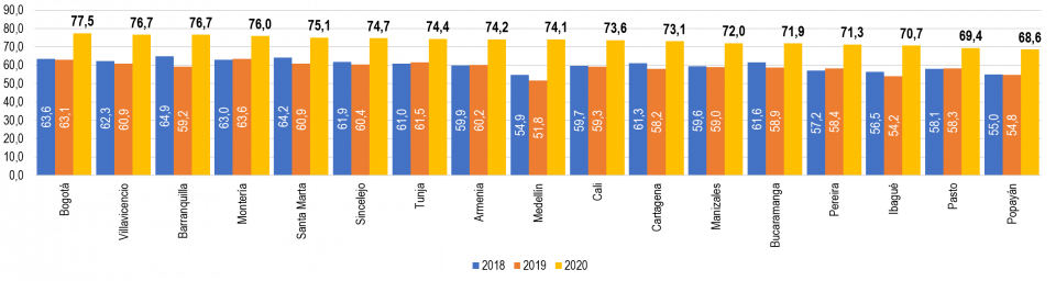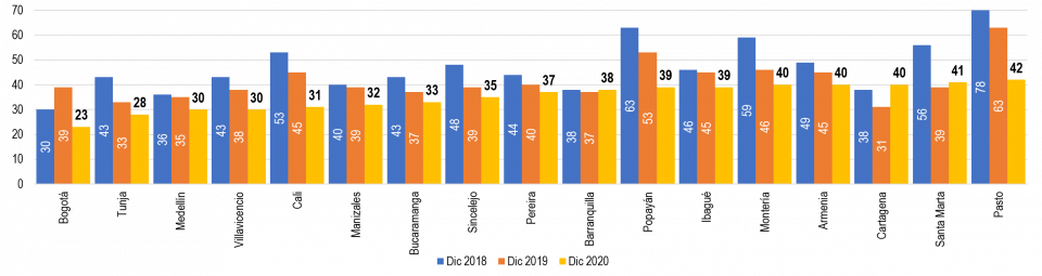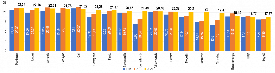Adicionalmente, para el comparativo por ciudades, se eligieron diecisiete (17) ciudades principales, bajo el criterio que fuesen capitales de departamento y que contaran con al menos 200 mil habitantes para finales de 2020.
