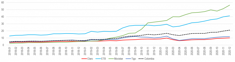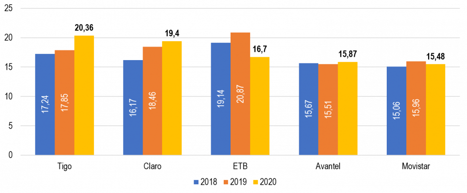 TIGO fue el proveedor con el mayor crecimiento relativo de 14,1%, entre 2019 y 2020, así como el que presentó el mayor crecimiento absoluto, de 2,51 Mbps.