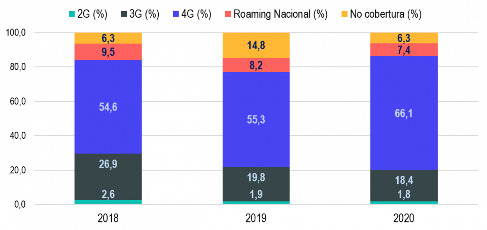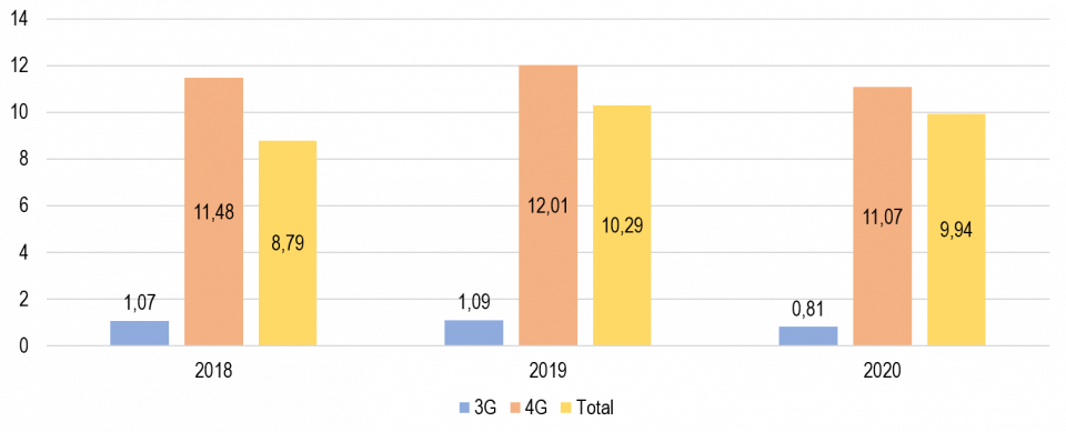 En cuanto a la tecnología 4G, en el periodo comprendido entre los años 2018 y 2020 la velocidad promedio de carga se mantiene alrededor de los 11,5 Mbps, mientras que la de 3G se ubica en 1 Mbps, en el periodo comprendido entre los años 2018 y 2020.