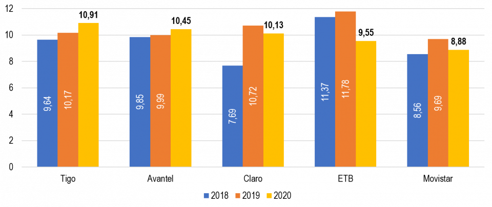 Para la Gráfica 13 se observa que TIGO registró la velocidad promedio de carga más alta en 2020 con 10,91 Mbps, seguido por AVANTEL con 10,45 Mbps, CLARO con 10,13 Mbps, ETB con 9,55 Mbps y MOVISTAR con 8,88 Mbps.
