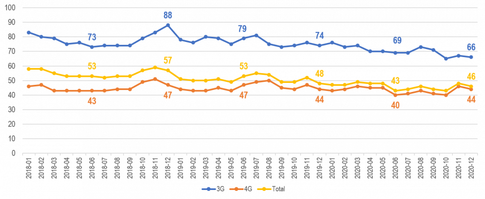 Para la tecnología 4G, la latencia promedio registrada para diciembre de 2020 fue de 44 ms y para 3G fue de 66 ms.