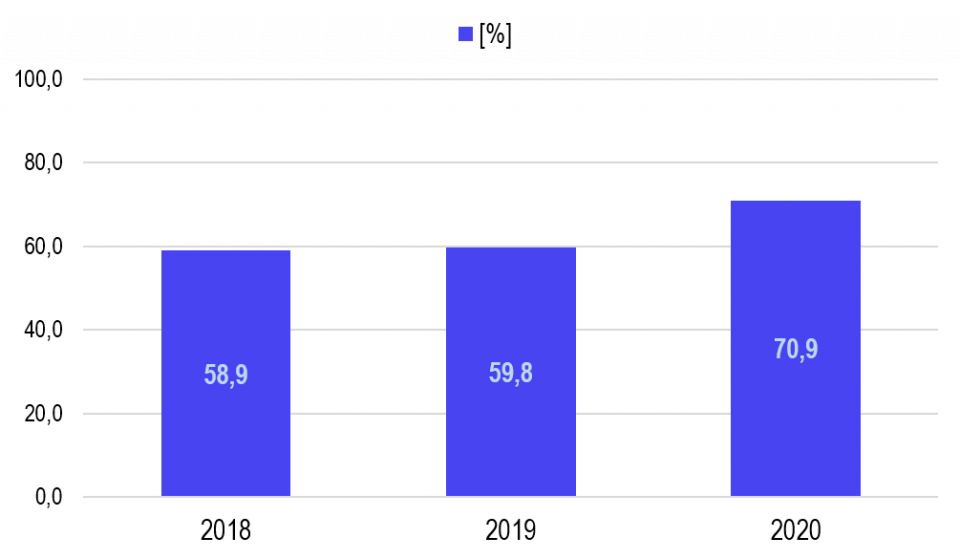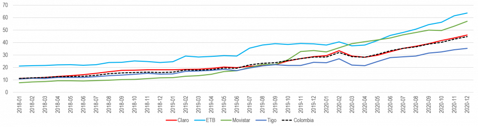 Para el año 2020 (Gráfica 18), el porcentaje de registro promedio en la red 4G fue de 70,9%, lo que representa un crecimiento de 11 puntos porcentuales con respecto a 2019 y 12 puntos porcentuales en relación con 2018.