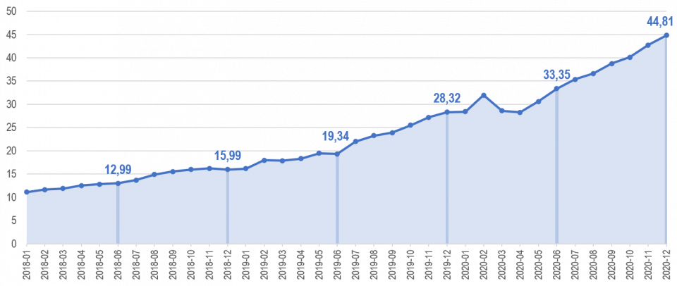 De acuerdo con las mediciones realizadas (Gráfica 1), para el servicio de internet fijo se evidencia una velocidad promedio de descarga a nivel nacional de 44,81 Mbps en diciembre de 20206, lo que representa un aumento del 58,2% con respecto al mismo mes de 2019, y del 180% en relación con diciembre de 2018.