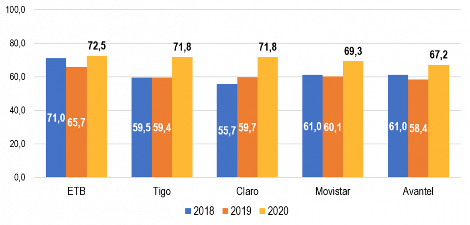 Bogotá fue la ciudad con la mayor disminución relativa, con 41%, entre diciembre de 2019 y diciembre de 2020, equivalente a 41%, mientras que Pasto, a pesar de tener la latencia más alta de las ciudades presentadas, mostró el mayor decrecimiento absoluto en el mismo período, correspondiente a 21 ms.