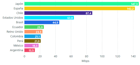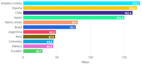 El país que presentó la velocidad promedio de descarga más alta, dentro de los países analizados, fue Estados Unidos con 173,7 Mbps, seguido por España con 169 Mbps. La velocidad promedio de descarga más baja entre los países del presente análisis fue Ecuador con 28,7 Mbps.
