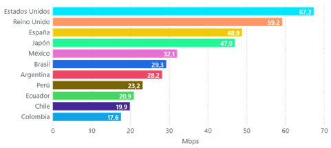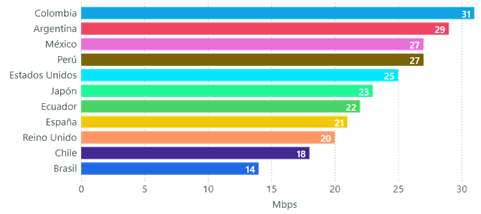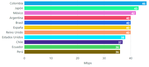 En esa gráfica se aprecia que las velocidades promedio de descarga más altas las obtienen Estados Unidos con 67,3 Mbps y Reino Unido con 59,2 Mbps. Colombia presenta la velocidad más baja de los países incluidos en la muestra, y muy cerca Chile con 17,6 Mbps.