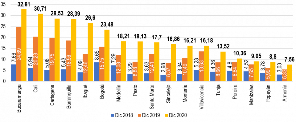 Cali fue la ciudad con la mayor disminución relativa de 13,2%, entre diciembre de 2019 y diciembre de 2020, mientras que Armenia mostró el mayor decrecimiento absoluto, de 8 ms.
