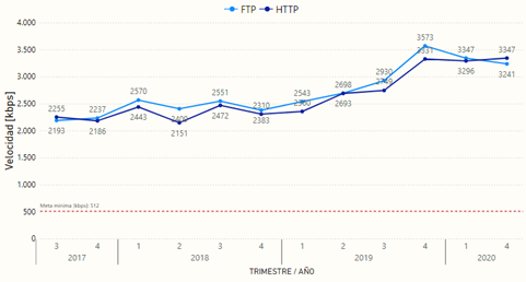 Para el 2020-4T2 se alcanzaron velocidades de 3,35 Mbps con HTTP y 3,24 Mbps con FTP, lo que comparado con 2019-4T muestra una variación de 0,5% y -9,3% respectivamente. Es importante tener en cuenta el valor objetivo establecido en la regulación es de 512 Kbps.