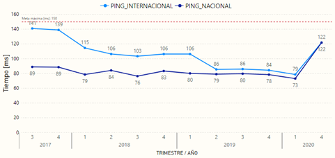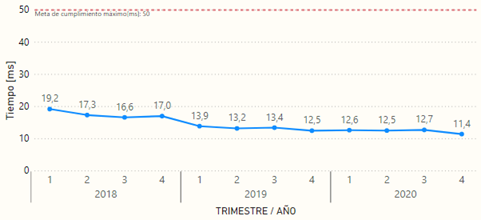 En general, el promedio global del indicador de retardo ha mostrado una tendencia a la mejora, iniciando con 19,2 ms en el 2018-1T, el cual se redujo un 41% para el 2020-4T, al llegar al mínimo de la serie histórica con 11,4 ms.
