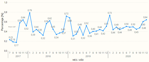 En el grupo denominado Resto de Departamento, este indicador presenta un comportamiento que oscila alrededor de un promedio de 0,47%, el cual se ha mantenido a lo largo de los últimos tres años. Dentro de la serie histórica 2017-2020 se encuentran picos que sobresalen durante diciembre y enero, y ocasionalmente en mitad de año.