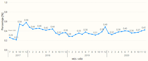 Por otra parte, en el grupo de Capitales y municipios Categoría 1, 2, 3 y 4, este indicador presenta un promedio global de 0,38%, con un comportamiento relativamente estable a lo largo del tiempo, cuyos valores promedio mensual se encuentran entre 0,28% y 0,50% para todos los meses observados entre enero de 2018 y diciembre de 2020. En el caso de las capitales, cada una registra cifras que tienden a dicho promedio global, con excepción de Inírida, Leticia, Mitú y San Andrés, las cuales presentan promedios superiores al 1%.
