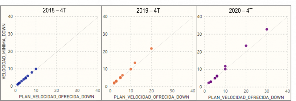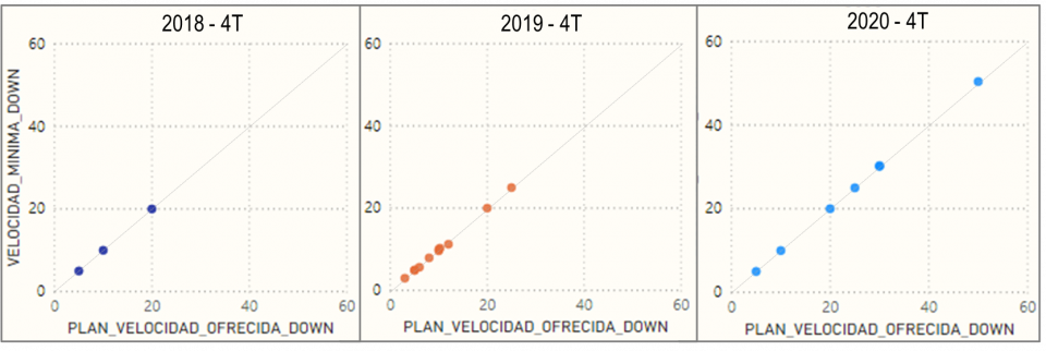 En contraste, el acceso fijo a Internet mediante LTE10 presenta velocidades mínimas de descarga más bajas que las ofertadas en sus planes de hasta 20 Mbps, según se observa en los reportes durante los últimos trimestres de 2018 a 2020.