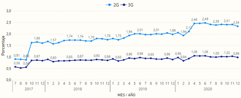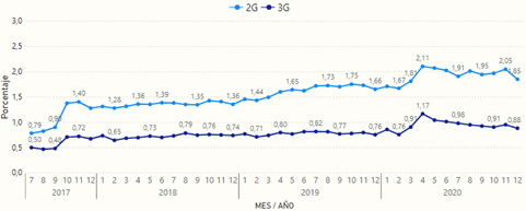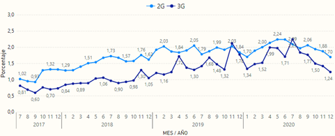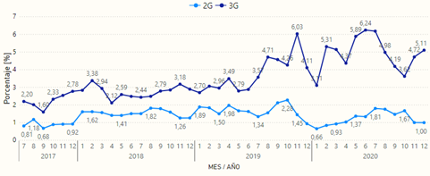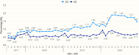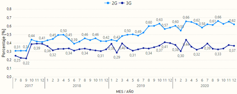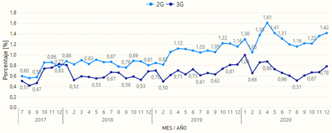 Así mismo, la curva para la tecnología 3G adopta una forma similar. Sin embargo, el pico máximo de la serie histórica se alcanzó en enero de 2020 con un valor de 1,00% de intentos no exitosos, con promedios anuales del 0,68% en el 2019 y 0,72% en el 2020. Estos porcentajes se encuentran por debajo de valor objetivo del 5% establecido en el régimen de calidad.