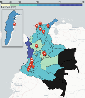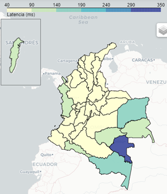 Los departamentos que presentaron los promedios de latencia más altos fueron Vaupés con 334 ms, Amazonas (174 ms), Vichada (150 ms) y San Andrés (129 ms).