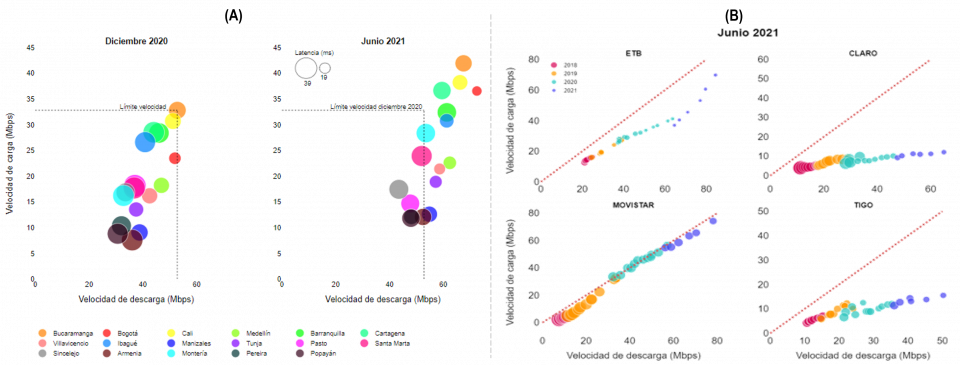 Para junio de 2021, se observa que la gran mayoría de ciudades superaron los valores máximos de velocidades de descarga de diciembre de 2020. No obstante, la mayoría de estas presentó un desplazamiento horizontal en el gráfico, lo que significa que han incrementado sus velocidades de descarga, mientras que los valores de velocidad de carga continúan siendo similares, razón por la cual varias de estas ciudades siguen por debajo de la máxima velocidad de carga de diciembre de 2020. En ese sentido, se obtiene que Bogotá, Montería e Ibagué son las ciudades que más crecimiento han presentado a nivel de velocidad11.