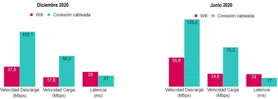 Para junio de 2021, la proporción entre ambos fue de 3. Para la latencia, la proporción entre conexión cableada y wifi, en ambos periodos fue aproximadamente de 0,7.