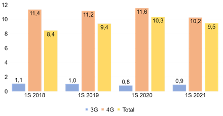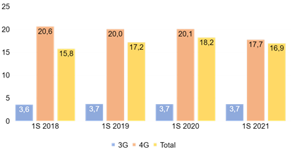 En cuanto a la tecnología 4G, el promedio de la velocidad de carga presenta un comportamiento alternante en los semestres contemplados en este análisis. Para el primer semestre de 2021, la disminución fue de 12,1% con respecto al primer semestre de 2020 y de 8,9% en relación con 2019. Para el caso de la tecnología 3G, el promedio de este indicador presenta un comportamiento alternante para los semestres contemplados en el análisis.