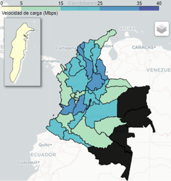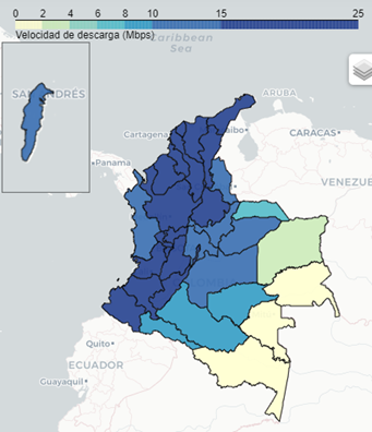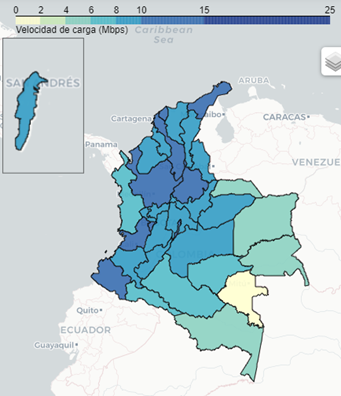 A su vez, los departamentos que presentaron los promedios de velocidades de carga más bajos fueron Guainía con 5,3 Mbps, Vichada (4,5 Mbps), Amazonas (4,5 Mbps) y Vaupés (2 Mbps).