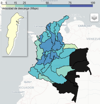 5. Los departamentos de Amazonas, Guainía, Vichada y Vaupés (en color negro en el mapa) no poseen muestras suficientes en junio de 2021 que permitan obtener el promedio de sus velocidades. ↩