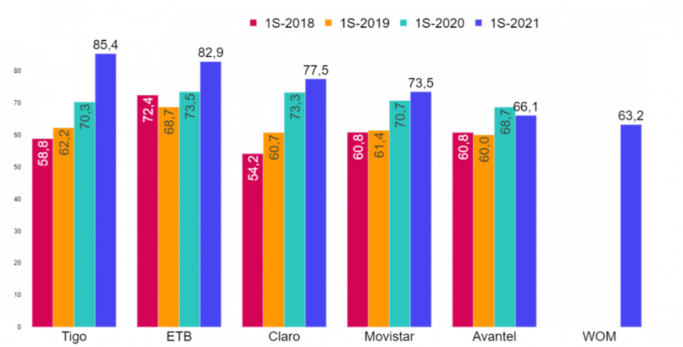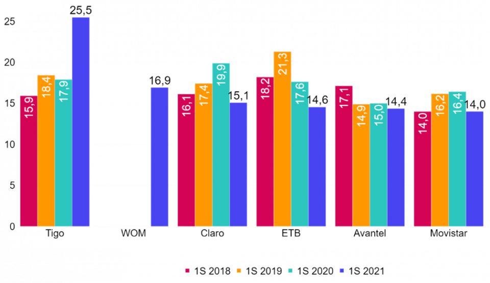 En cuanto a la tecnología 4G, TIGO registró la velocidad promedio de descarga más alta para el primer semestre del 2021 con 25,7 Mbps, seguido por WOM con 19,8 Mbps, AVANTEL con 16 Mbps, Claro con 15,6 Mbps, MOVISTAR con 15,2 Mbps y ETB con 14,4 Mbps. Para el primer semestre del 2021, TIGO fue el único proveedor que presentó un crecimiento en velocidad de descarga, de 42,4% a nivel general y de 27% en 4G, con respecto al primer semestre de 202016.