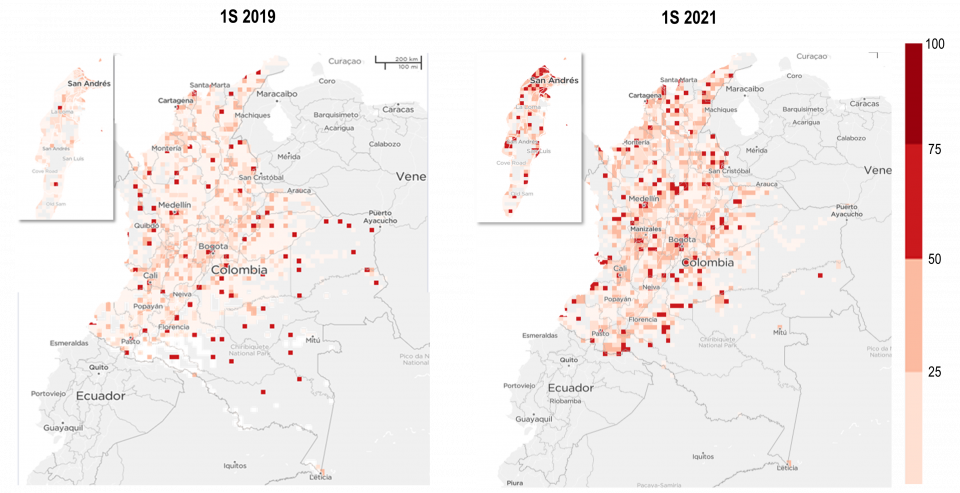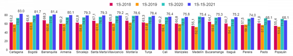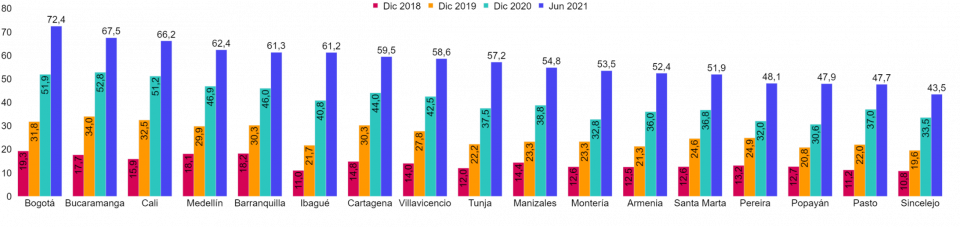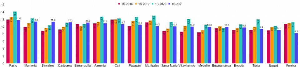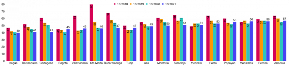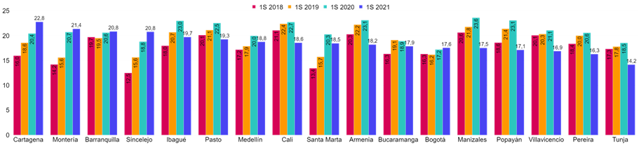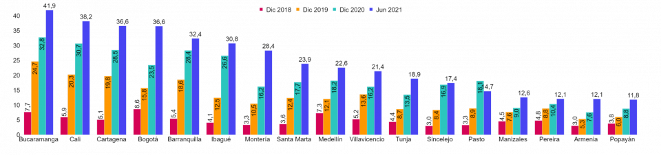 Cartagena fue la ciudad con la mayor disminución relativa de 19,6%, en el periodo comprendido entre el primer semestre 2020 y el primer semestre de 2021, mientras que Bogotá mostró el mayor crecimiento relativo, correspondiente al 9,8%.