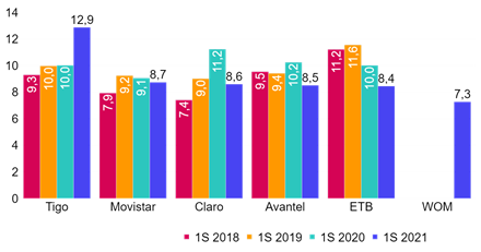 Entre el primer semestre de 2020 y el primer semestre de 2021, TIGO alcanzó el mayor crecimiento absoluto con 15,1 puntos porcentuales, al igual que el mayor crecimiento relativo con un valor del 21,5%.