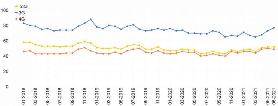 Para junio de 2021 se registró una latencia promedio de 52 ms en internet móvil a nivel nacional (Gráfico 28), lo que representa un aumento relativo de 20,9% en relación con el mismo mes de año anterior, y una disminución del 1,9% con respecto a junio de 2019. Para la tecnología 4G, la latencia promedio registrada para junio de 2021 fue de 49 ms y para 3G fue de 77 ms.