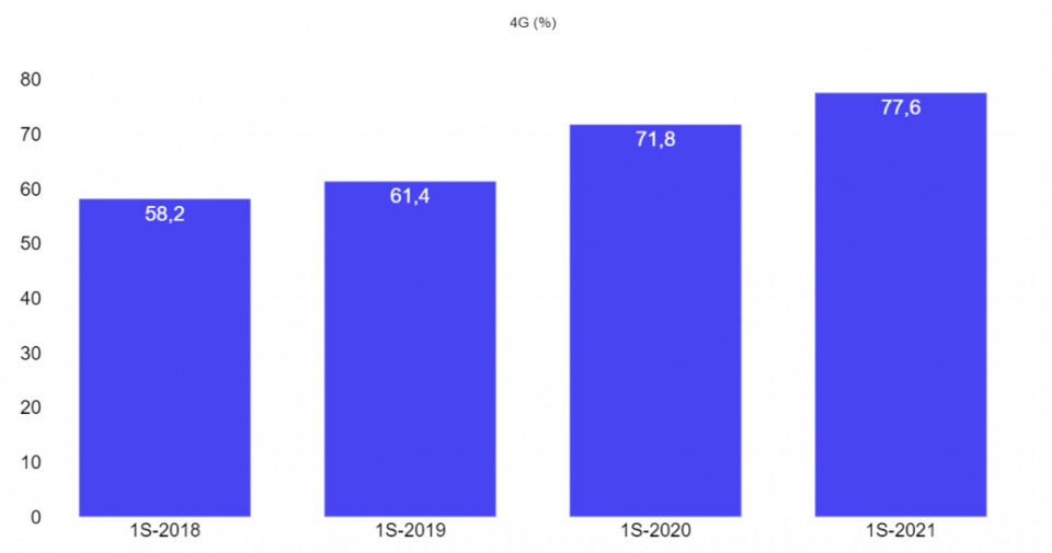 Respecto del porcentaje de registro promedio en la red 4G (Gráfico 33), se aprecia una tendencia creciente, con un aumento en el primer semestre de 2021 de 5,8 puntos porcentuales con respecto al primer semestre de 2020. Este comportamiento al alza podría estar asociado con el incremento en el despliegue de estaciones base con tecnología de acceso 4G por los operadores en los últimos años, y que se ha fortalecido en razón a la subasta de espectro llevada a cabo en diciembre de 201919.