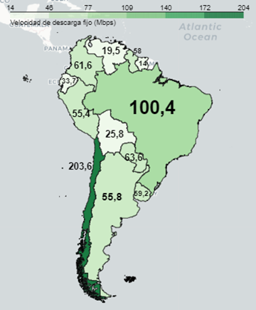 A nivel de Suramérica, en junio de 2021, el país que presentó la velocidad promedio de descarga más alta en Internet fijo fue Chile con 203,6 Mbps, seguido por Brasil con 100,4 Mbps. La velocidad promedio de descarga más baja fue registrada por Surinam con 14 Mbps. Colombia se ubicó en la cuarta posición con 61,6 Mbps.