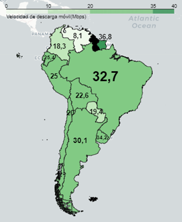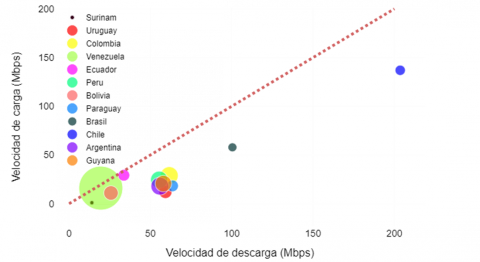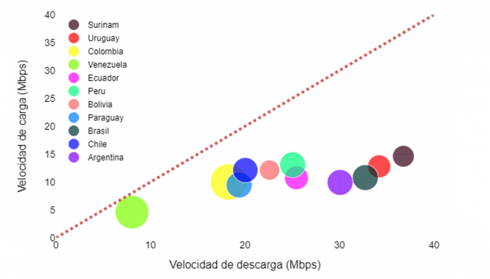 Adicionalmente, la mayoría de los países muestran una proporción entre la velocidad de descarga y de carga por un factor de 2, a excepción de Brasil y Argentina, quienes presentan una proporción de 3. Surinam es el país que presenta los valores superiores en términos de velocidades.